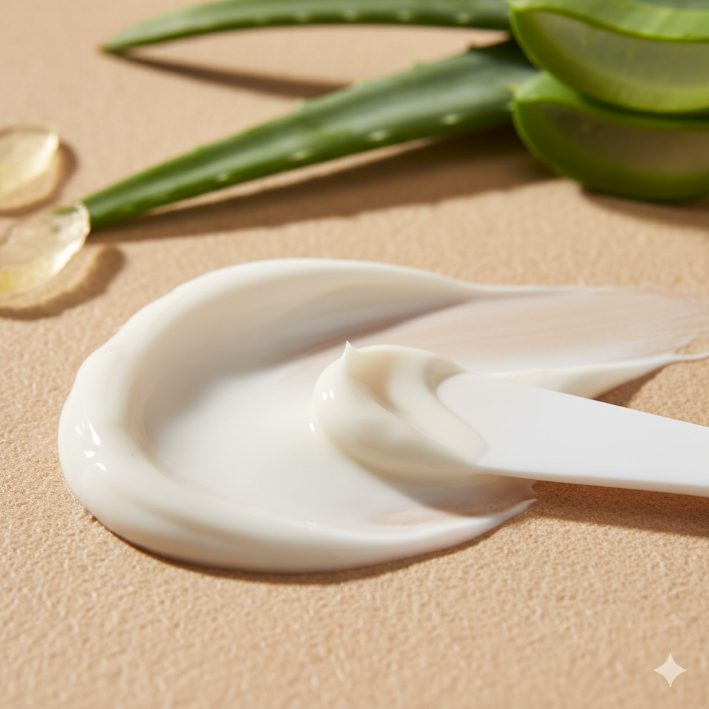 Aloe vera soothes and cools skin, helping reduce dryness and irritation often caused by sun exposure, while Vitamin E offers antioxidant support and helps reinforce the skin barrier.