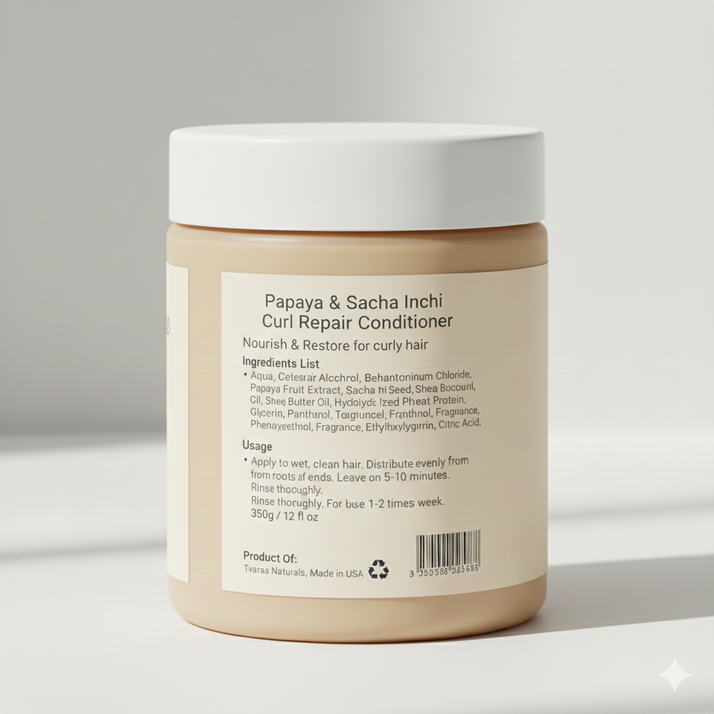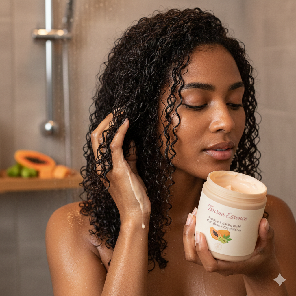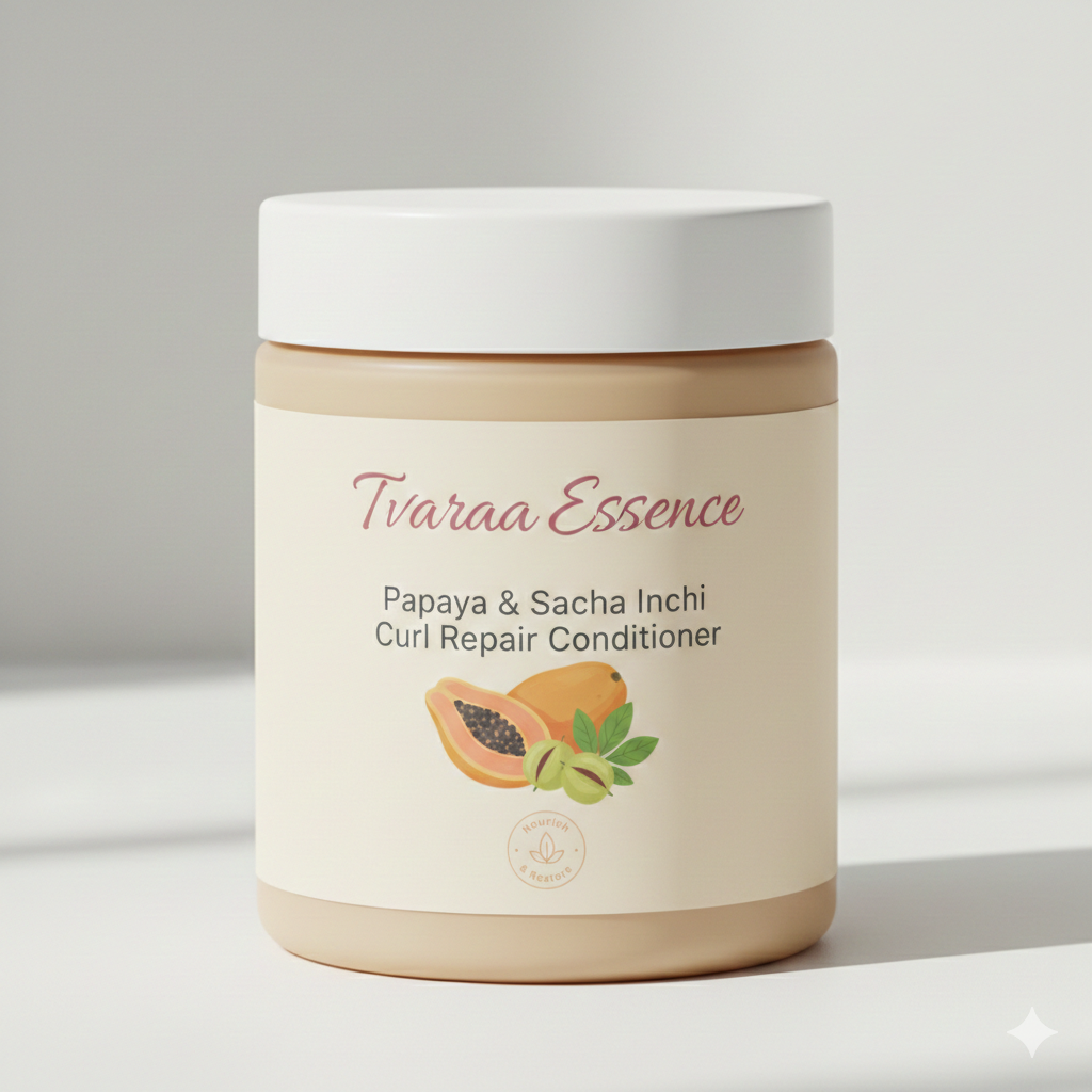 Bring damaged curls back to life with Tvaraa Essence Papaya & Sacha Inchi Curl Repair Conditioner, specially designed for curly and wavy hair that needs deep repair and nourishment.