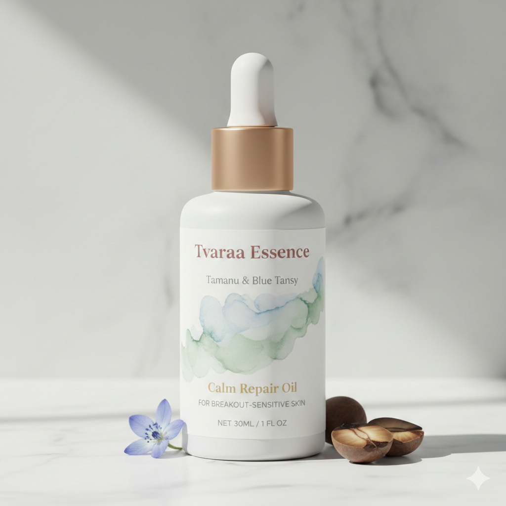 Tvaraa Essence Tamanu & Blue Tansy Calm Repair Oil is designed for sensitive, blemish-prone skin that needs gentle recovery support.